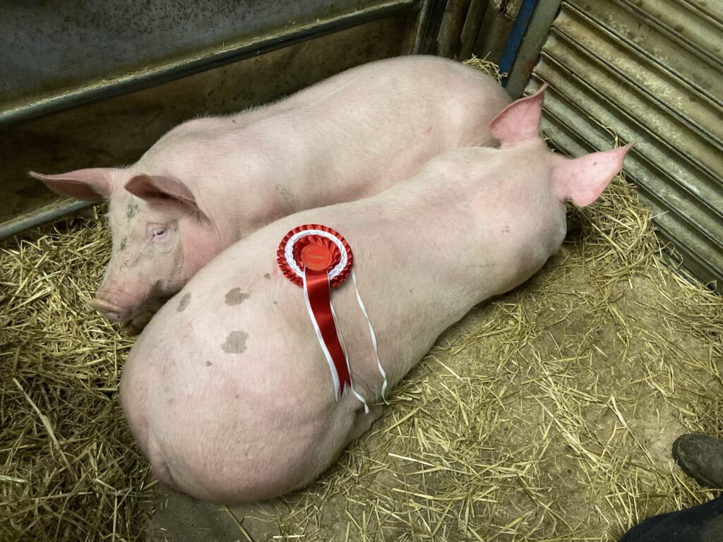 An excellent entry of pigs this Tuesday with the Show being kindly judged by Lee Machin, the Overall Champion was awarded to a pair of 104.5kg pigs from PF & PD Parsons, Whitchurch which sold for 300p/kg (£313.50/Head) to the Judge.
